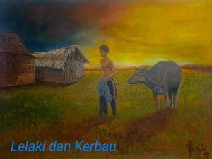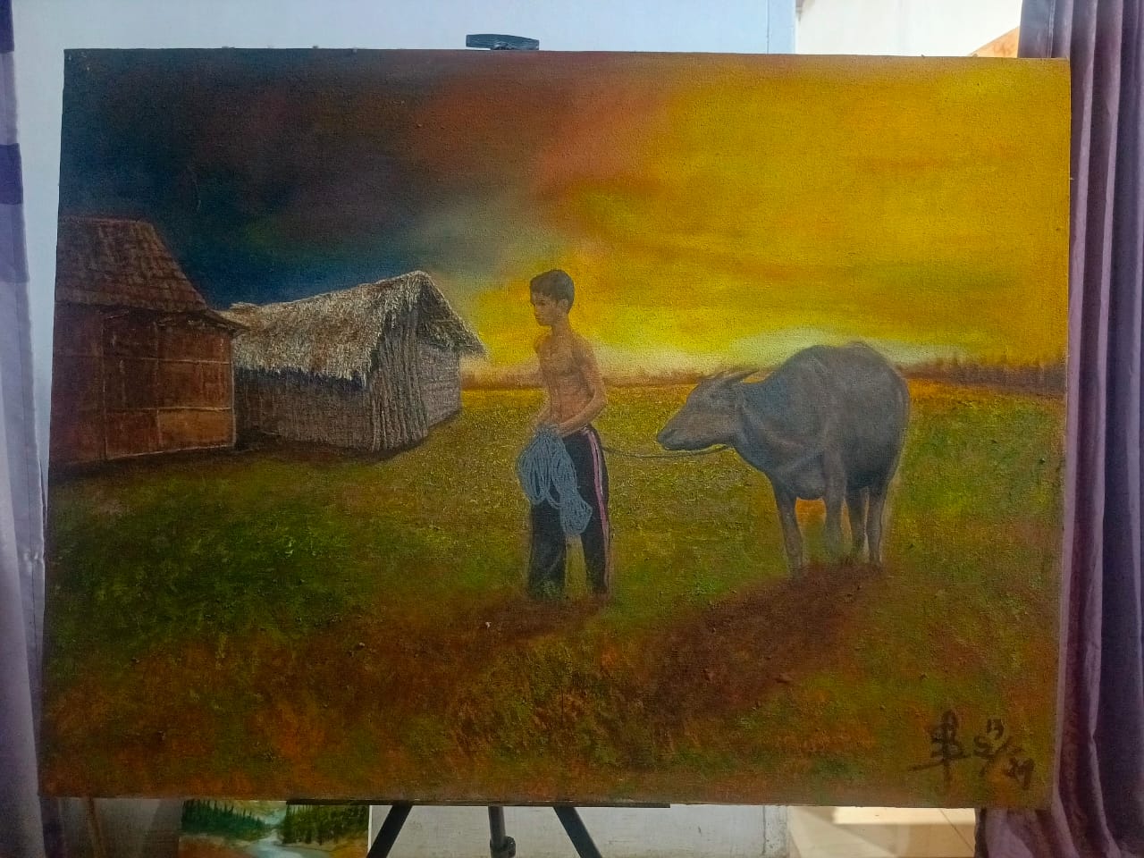 Lukisan ini adalah jendela kenangan—sebuah fragmen waktu yang abadi dalam balutan senja. Terlukis sosok seorang anak lelaki, bertelanjang dada, dengan tubuh ramping yang mengisyaratkan kerja keras sejak dini. Di tangannya tergenggam tali tambang, terhubung pada seekor kerbau yang setia berjalan bersamanya, keduanya pulang dari ladang setelah seharian menyatu dengan alam.